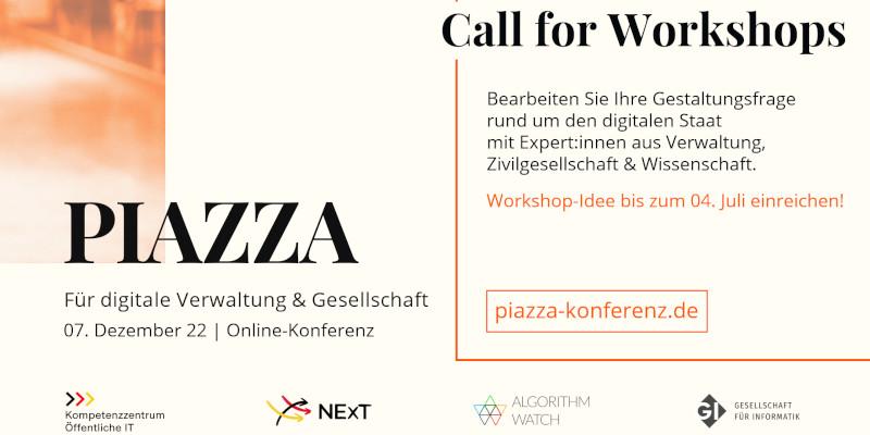 Am 07. Dezember 2022 bringt die »PIAZZA – Für digitale Verwaltung & Gesellschaft« zum zweiten Mal Menschen und Organisationen aus öffentlicher Verwaltung, Zivilgesellschaft und Wissenschaft in den Dialog. Über den offenen Call for Workshops können Sie ab sofort bis zum 04. Juli Workshop-Ideen einreichen. Mehr Informationen finden Sie auf der PIAZZA-Website.