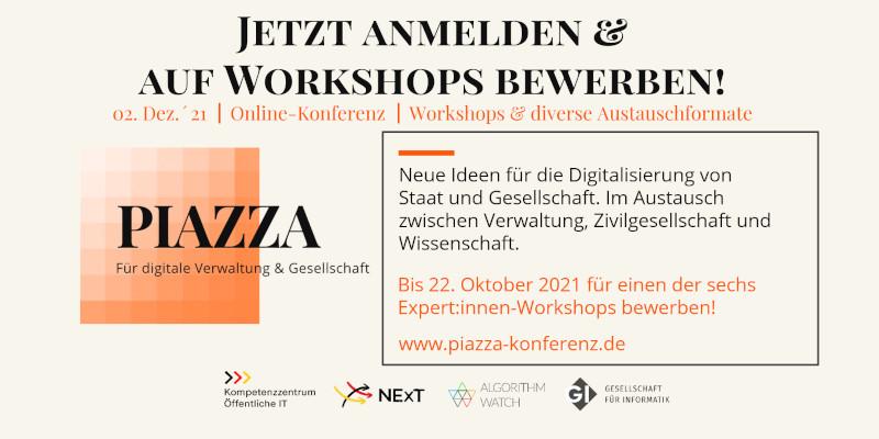 Am 2. Dezember öffnen wir die virtuellen Türen zur #PIAZZA2021! Das Programm aus Workshops und diversen Austauschformaten bringt Vertreter:innen aus Verwaltung, Zivilgesellschaft und Wissenschaft zusammen. Melden Sie sich an und bewerben Sie sich bis zum 22. Oktober auf unsere Workshops.