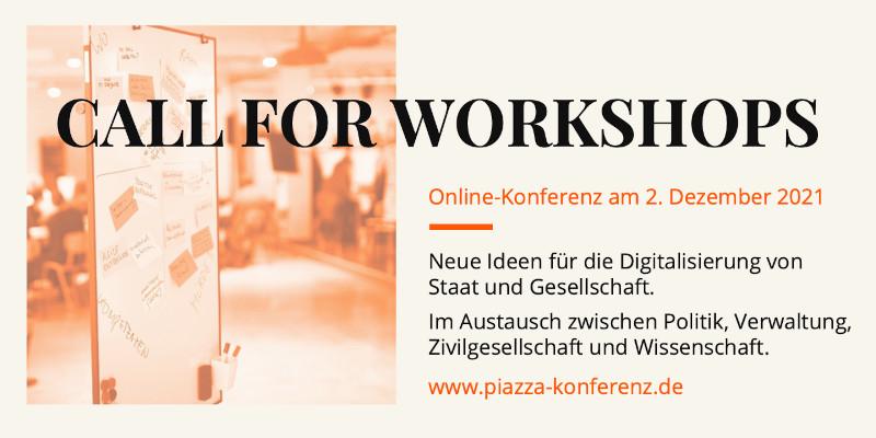 Bis zum 23. Juli läuft der »Call for Workshops« zur neuen Piazza-Konferenz am 2. Dezember 2021. Die PIAZZA soll Akteur:innen aus Verwaltung, Zivilgesellschaft und Wissenschaft zusammenbringen. Damit bieten die vier Trägerorganisationen allen Interessierten eine interaktive Plattform für den Austausch von neuen Ideen zur Digitalisierung von Staat und Gesellschaft. Wir freuen uns auf Ihren Beitrag!