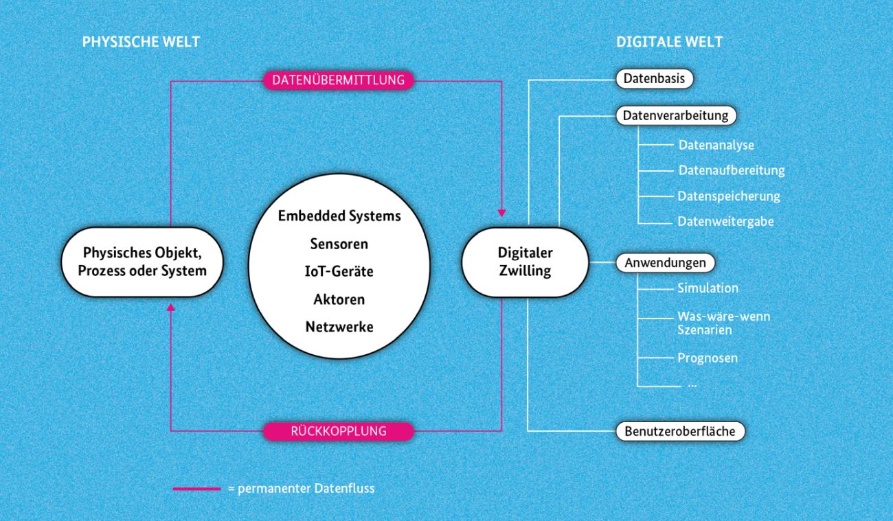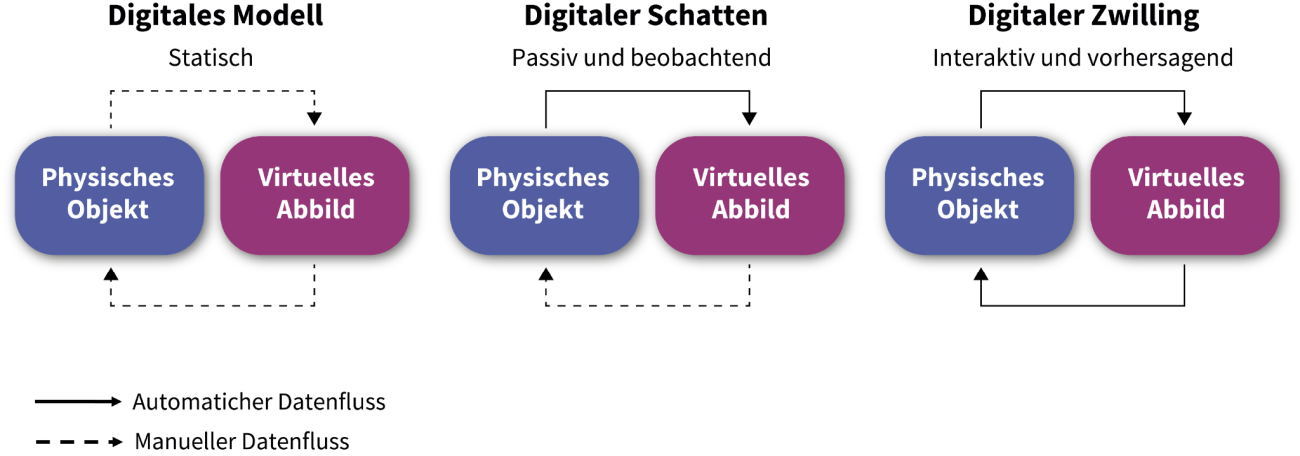 Digitale Zwillinge sind keine abgeschlossene Technologie, sondern ein offenes, dynamisches Konzept, dessen Umsetzung auf unterschiedlichen technologischen Komponenten basiert, darunter digitale Modelle, um physische Gegebenheiten zu simulieren sowie Sensoren, Datenplattformen und Anwendungen (vgl. Abb. 1).