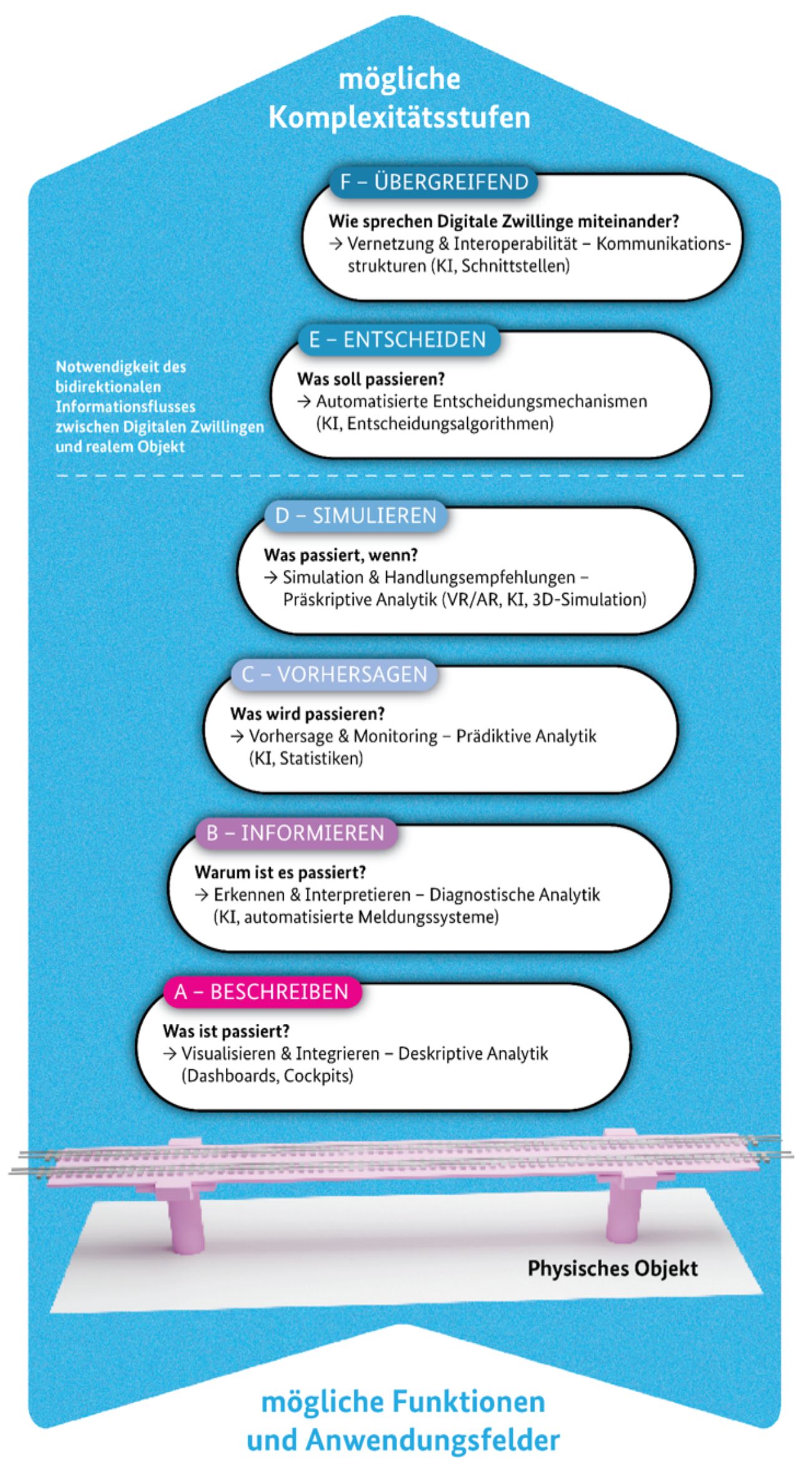 Demgegenüber lassen sich funktionsspezifische Nutzen differenzieren, zum Beispiel zur vorausschauenden Instandhaltung von Infrastrukturobjekten, die entlang eines Komplexitätsstufenmodells in sechs Stufen dargestellt werden können (vgl. Abb. 3).