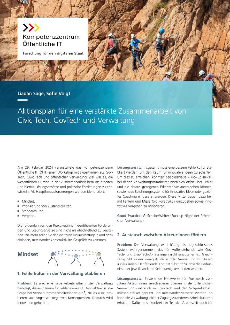 GovTech-Start-ups und Civic Tech-Organisationen finden sich trotz des Innovationspotenzials oft nicht mit der öffentlichen Verwaltung zusammen. In einem ÖFIT-Workshop wurden vier zentrale Herausforderungen für die Zusammenarbeit identifiziert: Mindset, Priorisierung von Zuständigkeiten, Standards und schwierige Vergabeverfahren. Dieser Aktionsplan stellt einige Lösungsansätze und politische Forderungen vor, die gemeinsam mit den Expert:innen des Workshops entwickelt wurden und die verstärkte Vernetzung von GovTech, Civic Tech und der öffentlichen Verwaltung fördern.