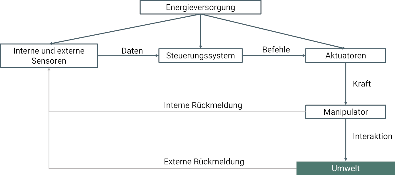 Ein geschickter Roboter besteht aus sechs Komponenten: Die Energieversorgung, das Steuerungssystem, mindestens ein Aktuator, ein Manipulator sowie externe und interne Sensoren. Bei der Energieversorgung handelt es sich in der Regel um Elektrizität, die kabelgebunden oder per Akku bereitgestellt wird. Das Steuerungssystem plant Aktionen und gibt Befehle an die Aktuatoren. Die Aktuatoren wandeln Energie in Bewegung um. Dabei kann es sich zum Beispiel um einen Motor handeln. Bei einem Manipulator handelt es sich um ein Bauteil, mit dem auf komplexe Weise mit der Umwelt interagiert wird. Hierbei kann es sich zum Beispiel um einen Greifarm handeln. Aus der Anzahl und den Typen der Gelenke ergeben sich Freiheitsgrade, die entscheidend sind für die Reichweite und die Beweglichkeit des Manipulators. Der Manipulator wird dabei durch Aktuatoren bewegt. Interne Sensoren erfassen den Zustand des Roboters, etwa die Position oder das Drehmoment eines Gelenks. Externe Sensoren erfassen Daten zur Umwelt. Dabei kann es sich zum Beispiel um Kameras oder Abstandssensoren handeln.