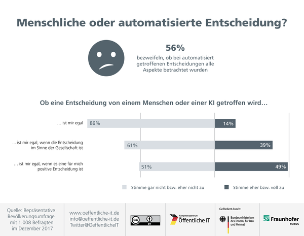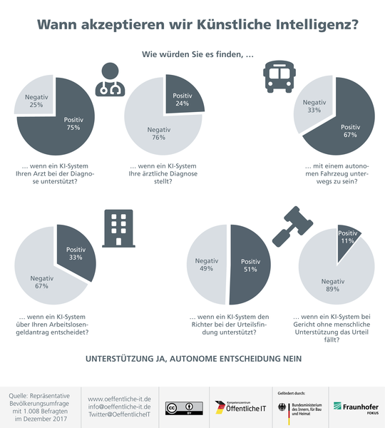 Die Aufgeschlossenheit gegenüber selbstfahrenden Fahrzeugen ist hoch: Zwei von drei Befragten würde gerne autonom unterwegs sein. Ganz anders werden Verwaltungsentscheidungen gesehen. Nur jede*r Dritte würde es begrüßen, wenn der eigene Arbeitslosenantrag von einer Künstlichen Intelligenz (KI) entschieden würde.