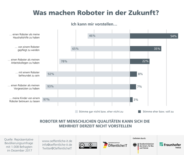 Roboter mit menschlichen Qualitäten sind noch ferne Zukunftsmusik, die sich die Mehrheit der Befragten derzeit nicht vorstellen kann. Dennoch gibt es auch hier Abstufungen. Während Roboter als Haushaltshilfe für die Hälfte der Befragten, in der Pflege für ein Drittel und als Kollege am Arbeitsplatz für ein Fünftel durchaus im Bereich des Vorstellbaren liegen, kann sich nicht einmal jede*r Zehnte vorstellen, mit einem Roboter befreundet zu sein, für einen Roboter zu arbeiten oder gar die eigenen Kinder von einem Roboter betreuen zu lassen.