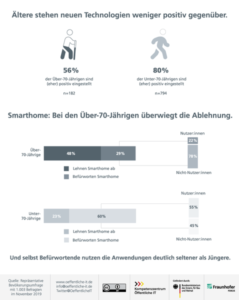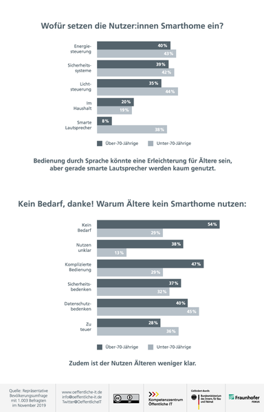 Heute sind weit mehr Geräte und verbesserte Funktionen verfügbar, die Ausstattung mit Smarthome-Technik ist erschwinglicher geworden. In jedem Baumarkt kann man mittlerweile vielfältige Komponenten für mehrere, konkurrierende Smarthome-Systeme kaufen, die in der Regel auch von Techniklaien erfolgreich in Betrieb genommen werden können. Jetzt allerdings lehnt fast die Hälfte der Über-70-Jährigen Smarthome-Anwendungen eher ab, weniger als ein Drittel befürwortet sie. Nur in dieser Altersgruppe ist die Ablehnung von Smarthome höher als die Befürwortung. Und selbst unter den älteren Befürwortenden nutzt nur rund jede:r fünfte Smarthome-Systeme. Diese haben sich in der vor rund 20 Jahren so aufgeschlossenen Gruppe also doch noch nicht etabliert.